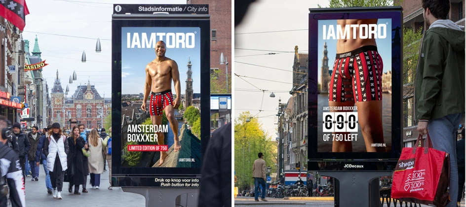 IAMTORO lanceert op 4 oktober de Amsterdam Boxxxer, een limited edition boxershort in een oplage van 750 genummerde stuks ter ere van 750 jaar Amsterdam. De introductie gaat gepaard met een outdoorcampagne die in realtime de voorraad toont. Daarmee zien voorbijgangers direct hoeveel exemplaren nog beschikbaar zijn.