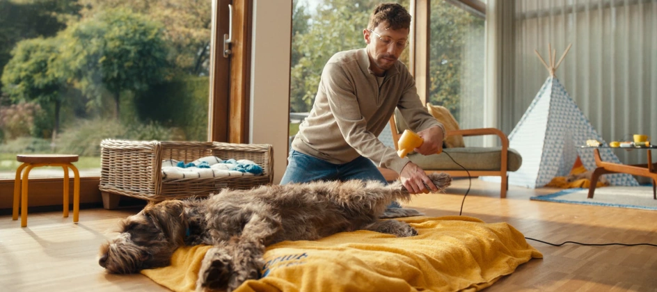 In de campagne zien we hond Buddy, die uitgebreid wordt geföhnd door zijn baasje dat is overgestapt naar goedkopere energie van ANWB. Omdat de energierekening lager uitvalt, kan de föhn gerust wat langer blijven blazen en wordt de overstap naar ANWB Energie op een luchtige manier verbeeld.