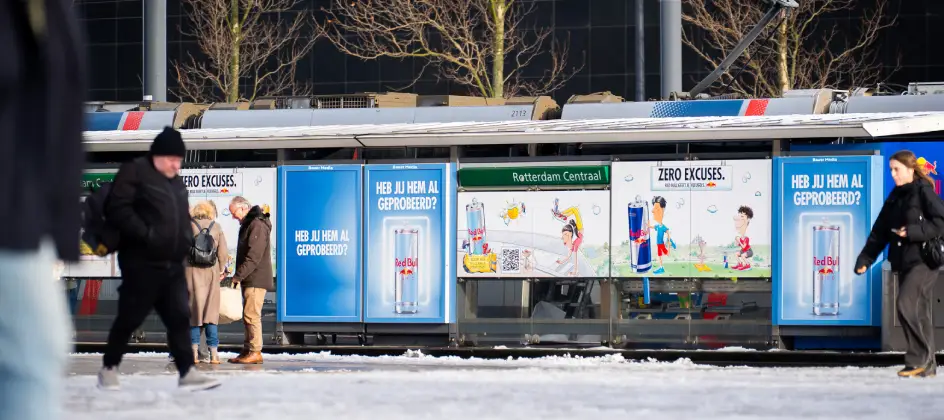 Bauer Media Outdoor heeft samen met Red Bull en PLAYAR een AR-vendingmachine geplaatst op het stationsplein bij Rotterdam Centraal. De activatie maakte deel uit van de Zero Excuses 2.0-campagne van Red Bull en was gericht op reizigers die wachtten bij een tramhalte.
