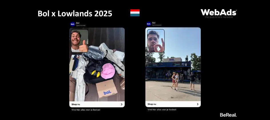 Met WebAds als exclusieve Nederlandse salespartner sloegen Dentsu, Crocodile Agency, bol en BeReal de handen ineen rondom de campagne. Met authentieke advertenties in BeReal-stijl, waarbij voor- en achtercamera gebruikt werden, toonden bol-influencers zowel hun online aankopen tijdens de voorbereiding op het festival als die op locatie.