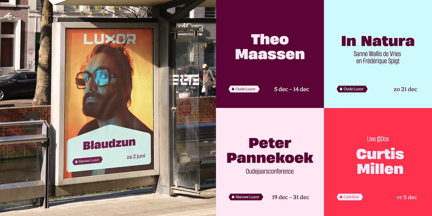 De aangescherpte visuele identiteit ondersteunt de bredere rol van Luxor in alle communicatie-uitingen. Typografie, waarin artiesten en programma’s centraal staan, blijft een herkenbaar element. Een uitgesproken pijlvorm zorgt voor richting, focus en samenhang binnen het systeem.