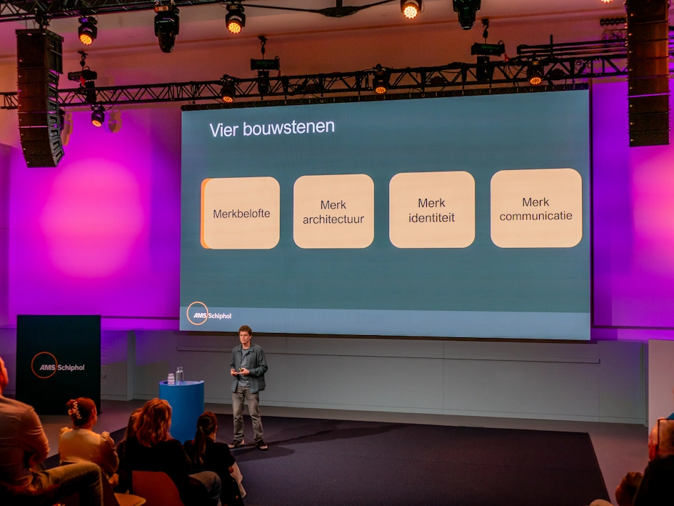 Sander Hengeveld, head of brand bij Royal Schiphol Group, presenteerde de nieuwe merkidentiteit van Schiphol aan de hand van vier pijlers.