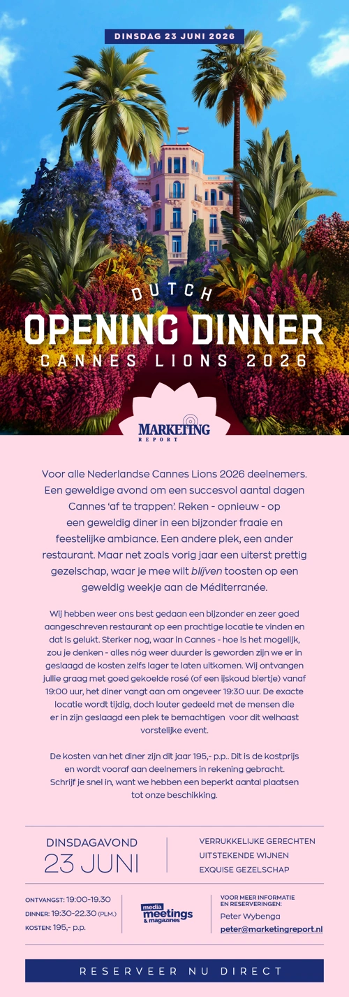 Voor Nederlandse deelnemers aan Cannes Lions 2026 wordt op dinsdag 23 juni een gezamenlijk diner georganiseerd. Het evenement markeert de start van de festivalweek en brengt vakgenoten samen in Cannes.