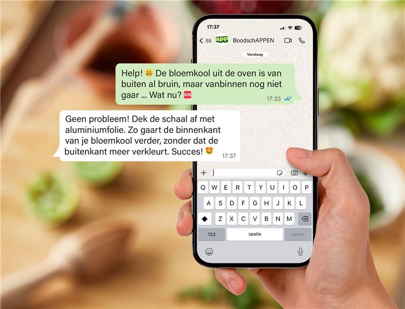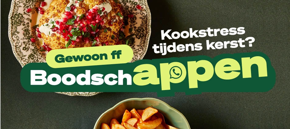 De activatie Kookstress tijdens kerst? Gewoon ff BoodschAPPEN! geeft consumenten directe ondersteuning via WhatsApp. Josephine de Roode, culinair expert bij Boodschappen.nl: "Onze redactie is op 23, 24, 25 en 26 december van 10:00 tot 18:30 uur bereikbaar via WhatsApp op nummer 0617086086 voor alle brandende vragen. Of je jus te zout is of je taartbodem te zacht. App ons en al je kookstress verdwijnt als sneeuw voor de zon."