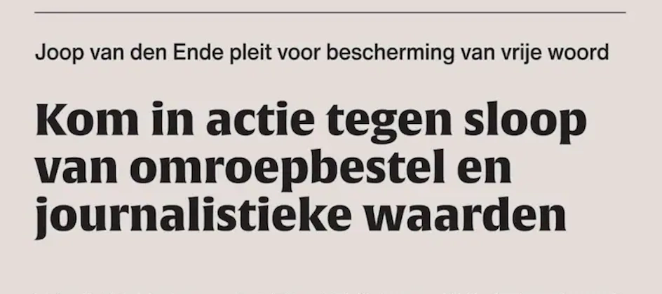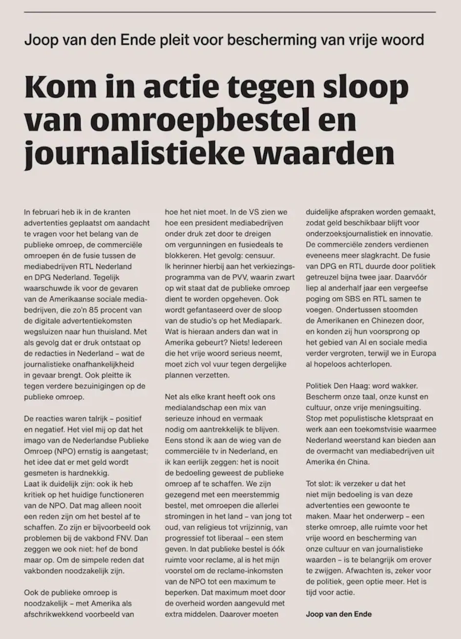 Media- en theaterondernemer Joop van den Ende heeft voor de tweede keer dit jaar via een paginagrote advertentie in dagbladen opgeroepen tot actie tegen wat hij noemt de sloop van het omroepbestel en journalistieke waarden. Na zijn eerste advertentie die in februari 2025 geplaatst werd, valt het hem op dat er veel kritiek is op de NPO. Ook hijzelf heeft kritiek op het huidige functioneren van de NPO, maar dat is voor hem geen reden om het af te schaffen.
