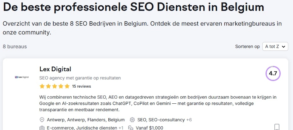 Semrush geldt wereldwijd als één van de meest gezaghebbende platformen voor zoekmachineoptimalisatie. De Agency Overview is geen marketinglijstje, maar een objectieve evaluatie die kijkt naar reputatie, prestaties en expertise. Dat Lex Digital daarin zo hoog eindigt, onderstreept de impact van hun aanpak als SEO bureau met focus op duurzame groei.