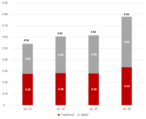 De analoge OOH-omzet stijgt met 20 procent naar 33 miljoen euro. Digitale Out of Home (DOOH) groeit sterker en komt uit op circa 45 miljoen euro, een stijging van 32 procent. Daarmee neemt het aandeel digitaal binnen de totale OOH-omzet toe van 54 procent in Q1 2025 naar 57 procent in Q1 2026.