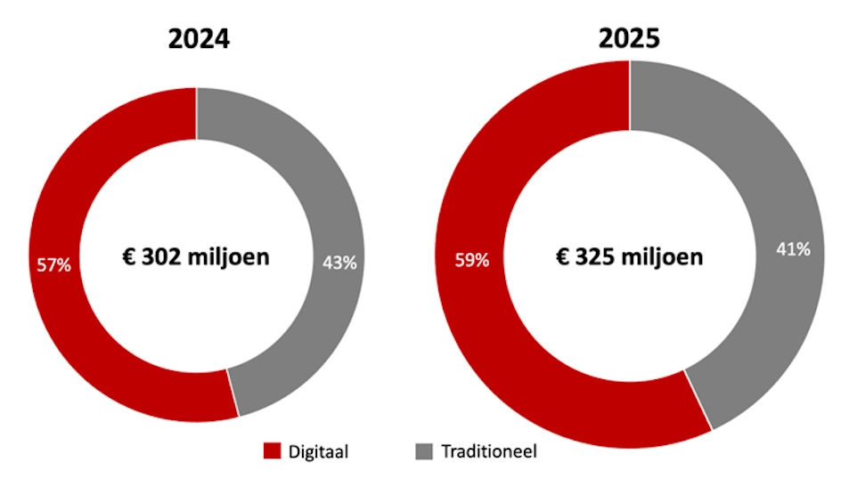 Het aandeel digitaal is verder opgelopen. In 2024 was 57 procent van de omzet digitaal, in 2025 is dat gestegen naar 59 procent. Binnen digitaal blijft ook programmatic inkoop zich ontwikkelen. Programmatic bestedingen groeiden met 15 procent en vertegenwoordigen inmiddels 27 procent van het digitale segment. Daarmee groeit deze vorm van inkoop mee met de markt.