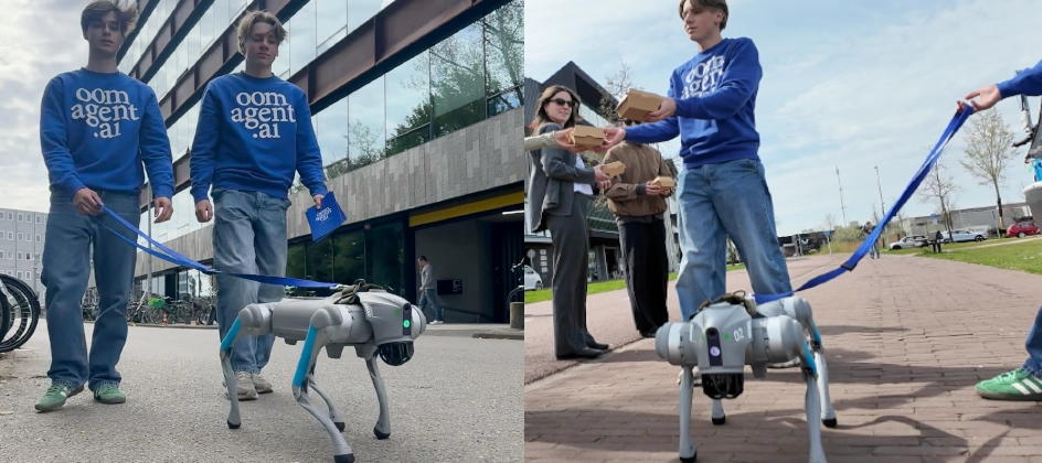 OomAgent heeft zich in Amsterdam opvallend gepresenteerd met een fysieke actie langs creatieve bureaus. In de Houthavens en de Schinkel bezocht het team bureaus samen met een AI-robothond en deelde het blauwe donuts uit.