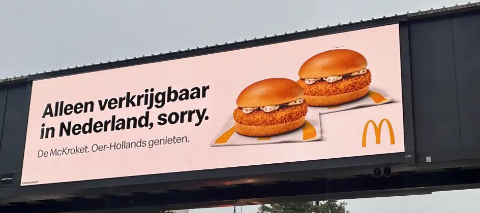Het billboard, geplaatst op loopafstand van het TeamNL-huis in Milaan, droeg de tekst: Alleen verkrijgbaar in Nederland, sorry. De McKroket. Oer-Hollands genieten. Daarmee benadrukt McDonald’s dat de snack exclusief in Nederland verkrijgbaar is.