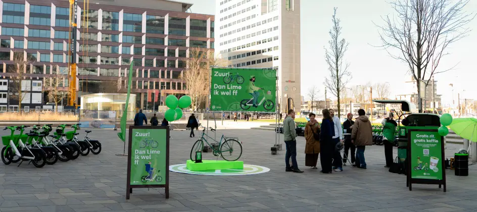Met de boodschap Zuur! Dan Lime ik wel ff. positioneert Lime zijn e-bikes als praktische optie voor dat soort momenten. Gebruikers kunnen via de app direct een fiets ontgrendelen en vertrekken.