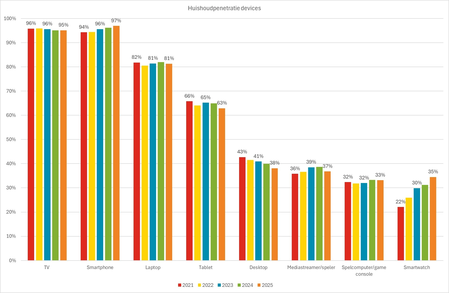 Tegelijkertijd blijft de aanwezigheid van televisies opvallend stabiel. In de afgelopen 5 jaar is de penetratie nauwelijks gedaald, wat wijst op een blijvende rol binnen het huishouden.