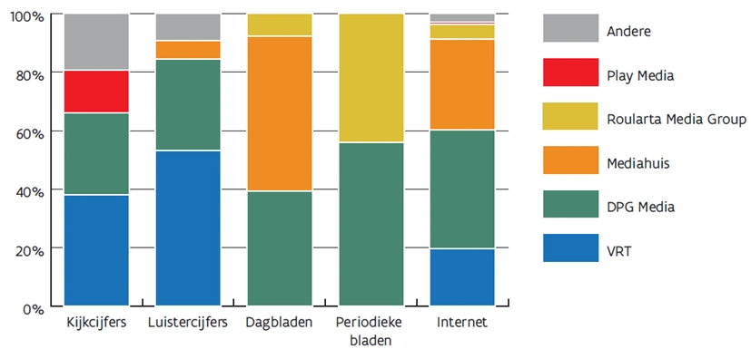 - Hoewel er niet één speler is die de hele Vlaamse mediasector domineert, blijken veel vormen van horizontale, verticale of crossmediale concentratie te bestaan in en tussen een aantal segmenten van verschillende Vlaamse mediavormen. Voor de aggregatie van klassieke mediaproducten blijft 80 tot 100 procent van de markt in handen van slechts vijf mediagroepen: VRT, DPG Media, Mediahuis, Roularta Media Group en Play Media (van Telenet). DPG Media is als enige actief in alle mediaproducten en ontpopt zich als toonbeeld van een crossmediale mediagroep.