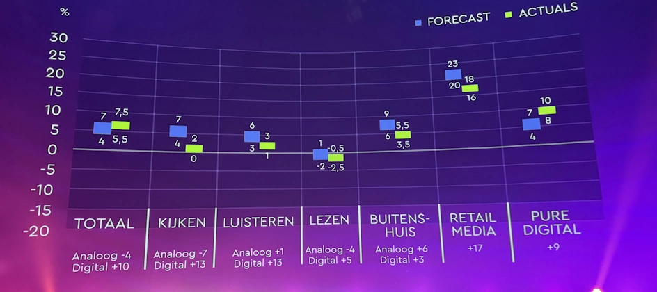 Zijn 2025-voorspellingen kwamen weliswaar in totaal redelijk goed uit (voorspeld 4 tot 7 procent stijging, werkelijk 5,5 tot 7,5 procent stijging). Op detailniveau zat Remon Buter er soms naast. Zo is de werkelijke groei bij video 0 tot 2 procent, terwijl Remon Buter 4 tot 7 procent had voorspeld. Out of Home groeit in werkelijkheid minder snel dan de WPP Mediaman had voorspeld (3,5 procent tot 5,5 procent). Wel was de tendens juist net als bij retail media die 16 tot 18 procent steeg (Remon Buter dacht een nog grotere stijging bij Retail Media). Opvallend is dat pure Digital 8 tot 10 procent stijgt in 2025.